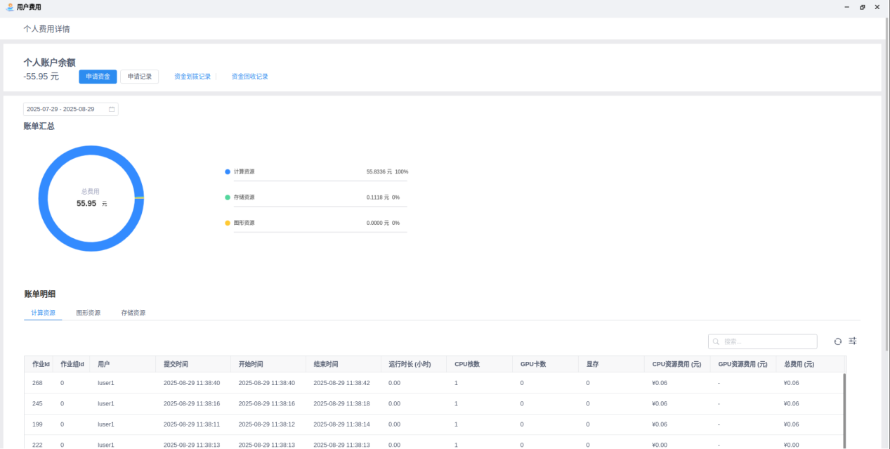 为让用户清晰掌握资源消耗与费用构成,我们打造了个人与部门双维度账单统计界面,以“明细 + 可视化”的形式呈现费用信息,保障每一笔支出透明可控。