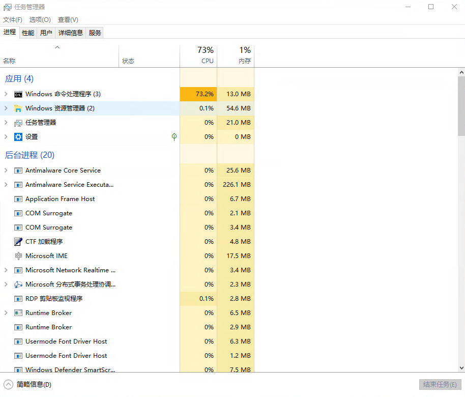 任务管理器「进程」和「性能」页:CPU 利用率约 73%