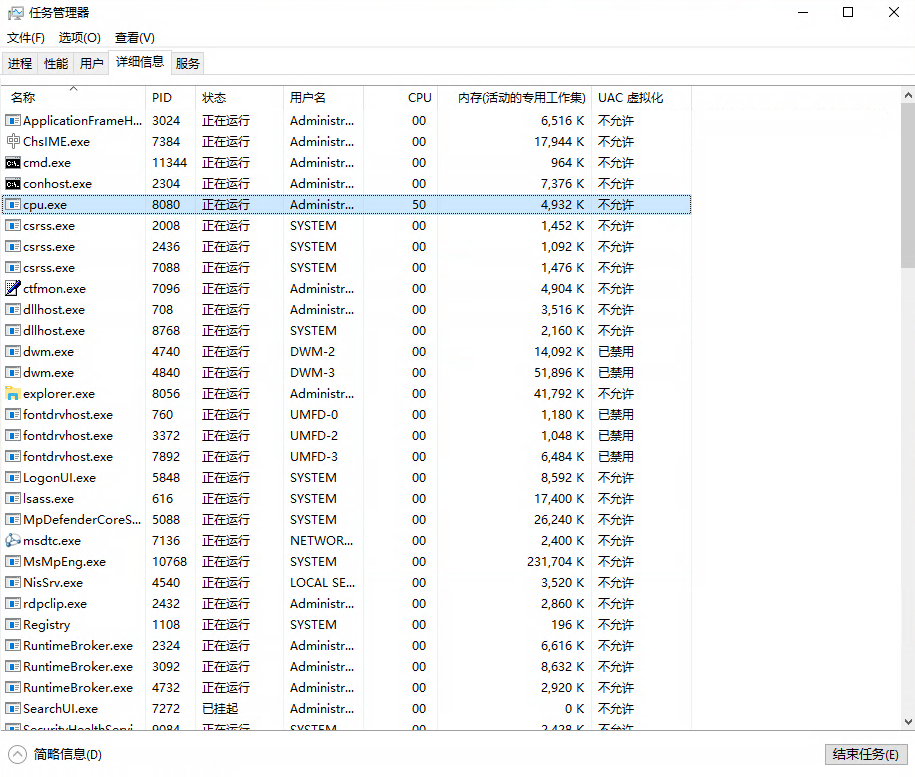 Process Explorer /「详细信息」页:CPU 利用率约 50%