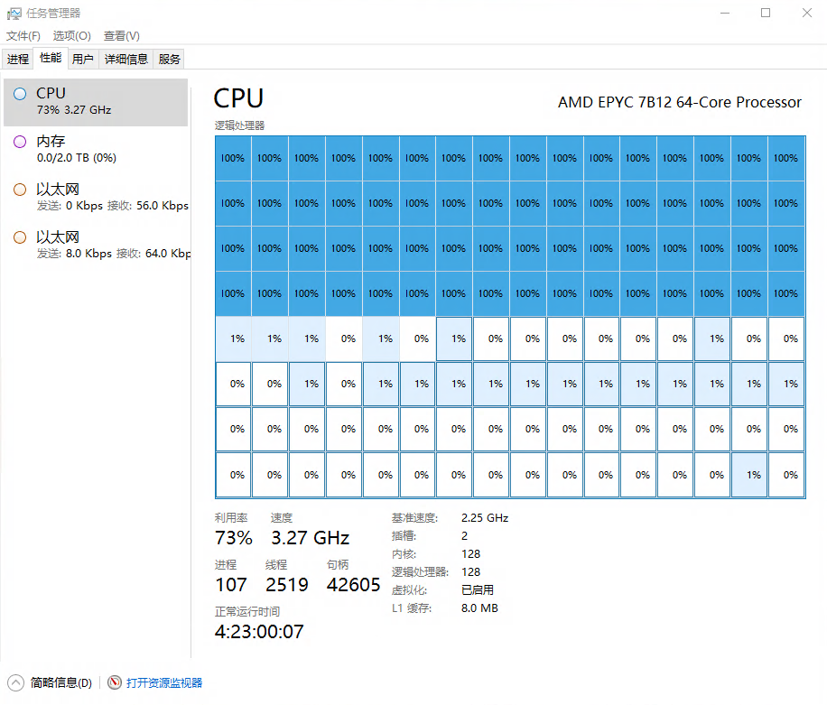 为了验证这一机制,我们在一台 128 核、2 个 Processor Group 的 Windows 测试节点上进行了实验: